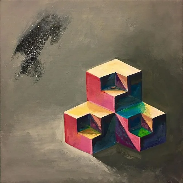 Mike’s paintings feature an emphasis on strong contrast, as well as the relationship between scale, space and geometry in order to create truly alien images. Mike is mostly self taught, using only Cyan, Magenta, Yellow and White paint to mix all of his other colors and occasionally adding acrylics together.